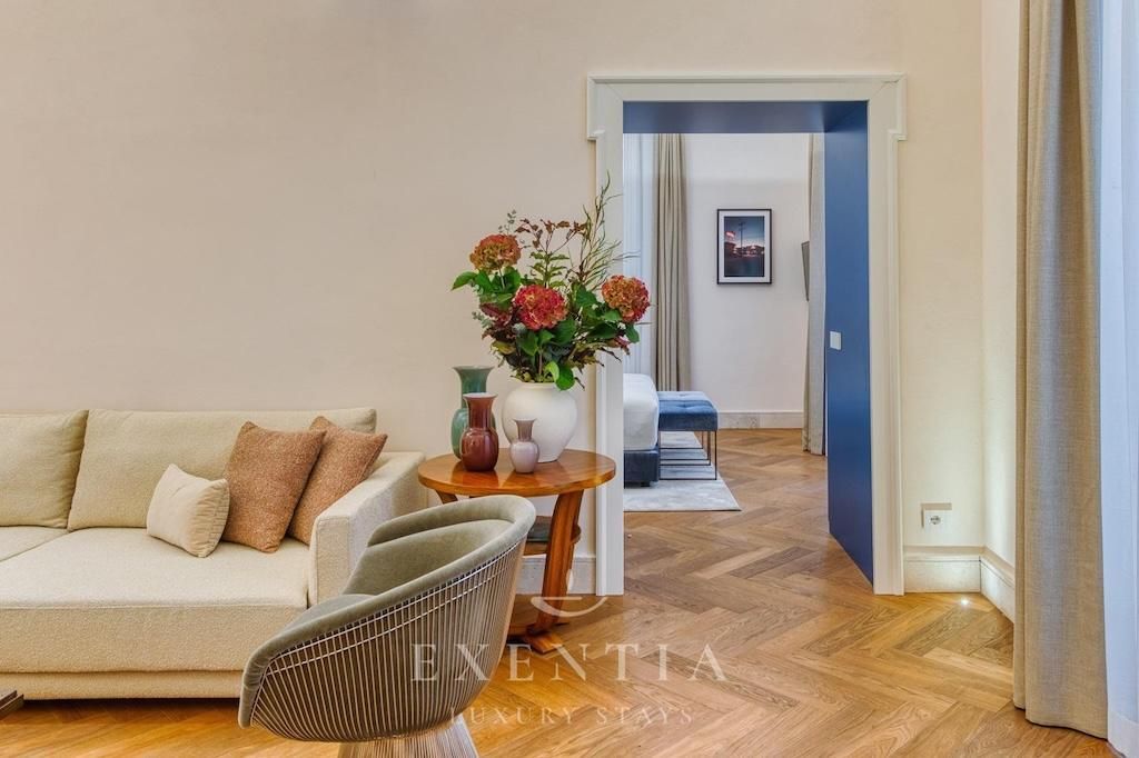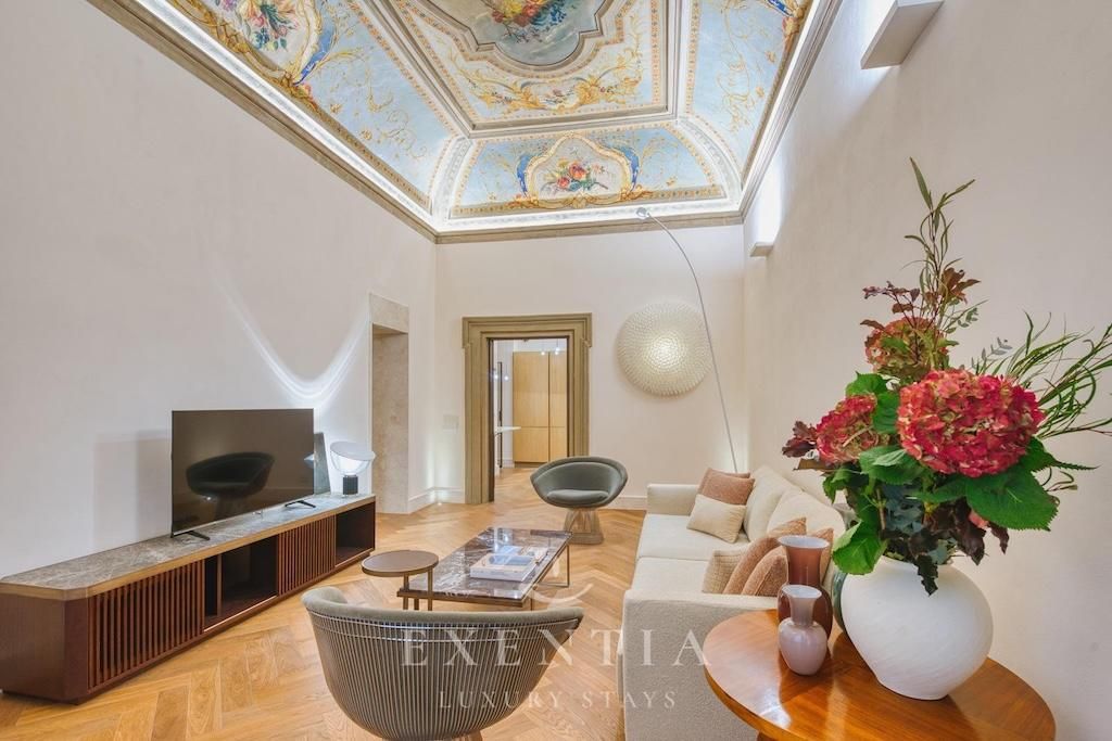 From the very first moment, the apartment reveals its soul: breathtaking frescoed ceilings, bathed in natural light, rise above beautifully restored herringbone parquet floors. Every space has been curated with impeccable taste, blending noble architectural elements with contemporary design.