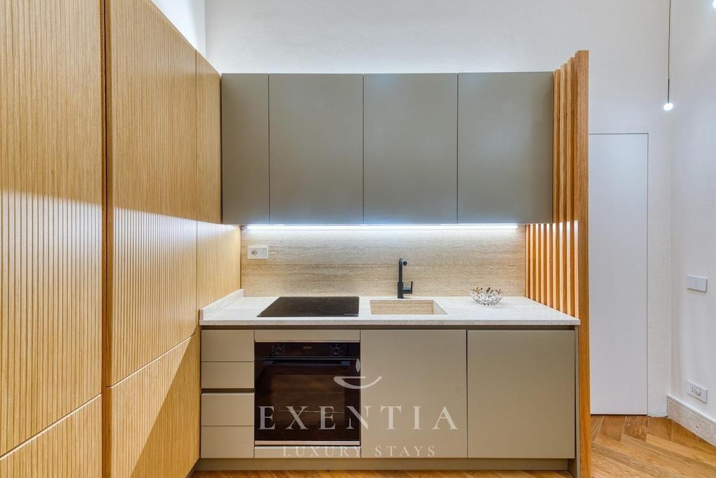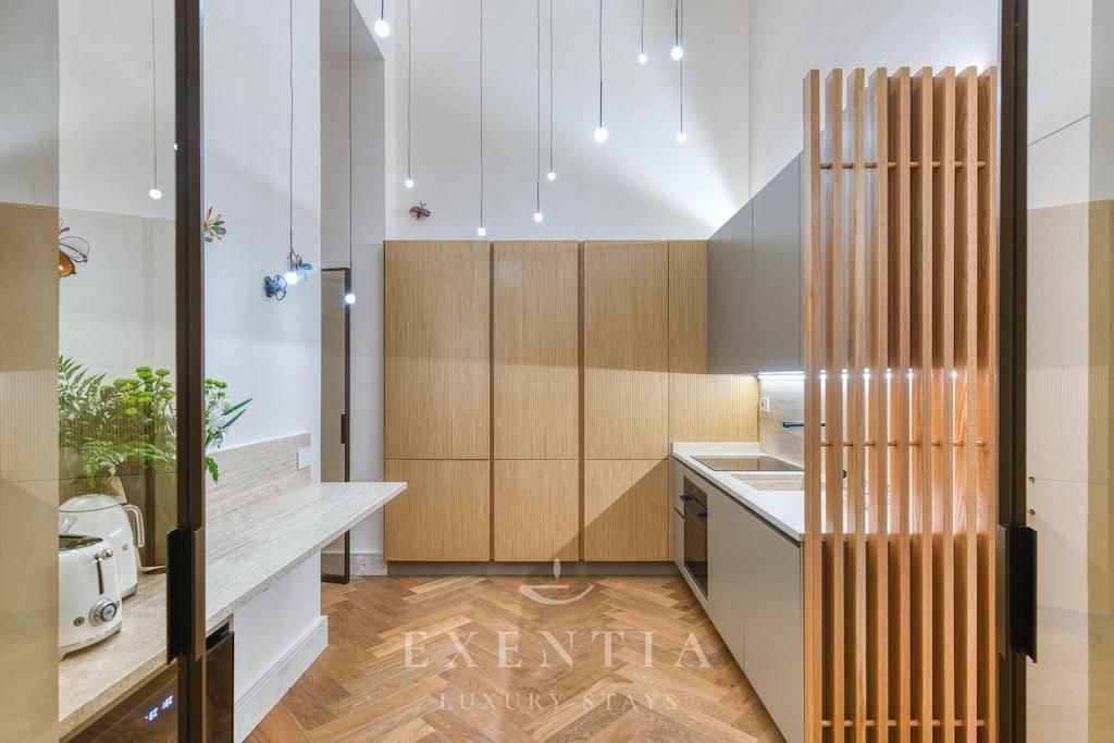 The kitchen, sleek and fully equipped, is seamlessly integrated yet discreet, offering both functionality and elegance.