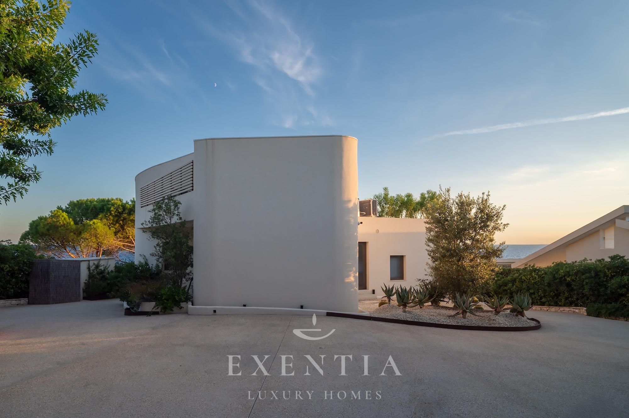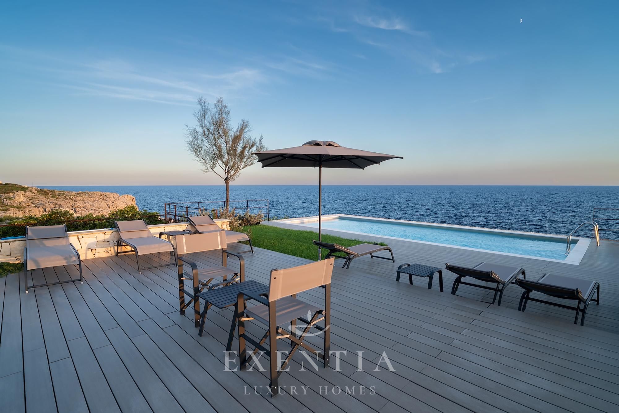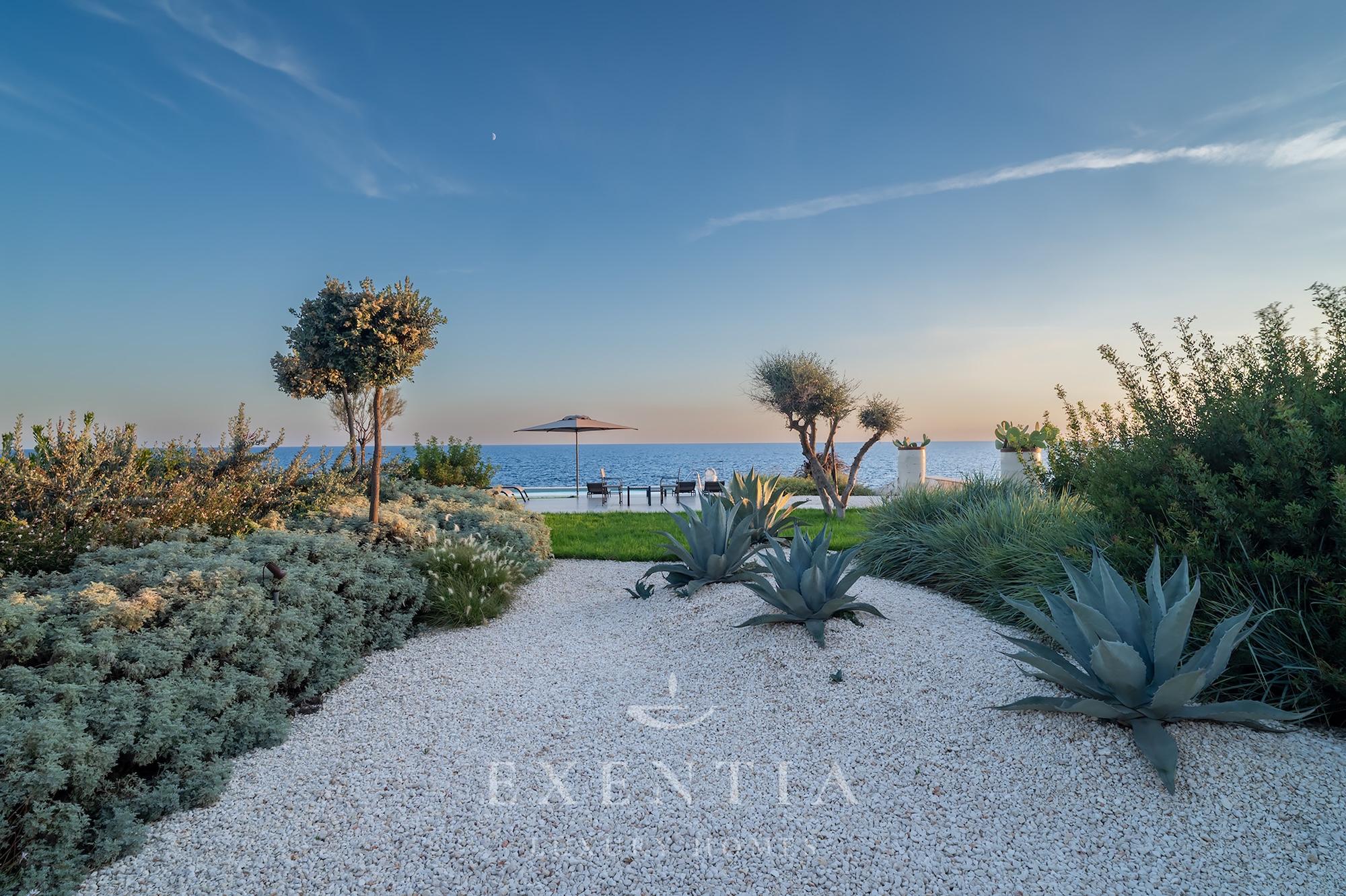 Outdoors, an infinity pool merges seamlessly with the horizon, suspended between sky and sea. Around it, a garden of aromatic essences — thyme, mastic, coastal lavender — accompanies the slow rhythm of the days.
