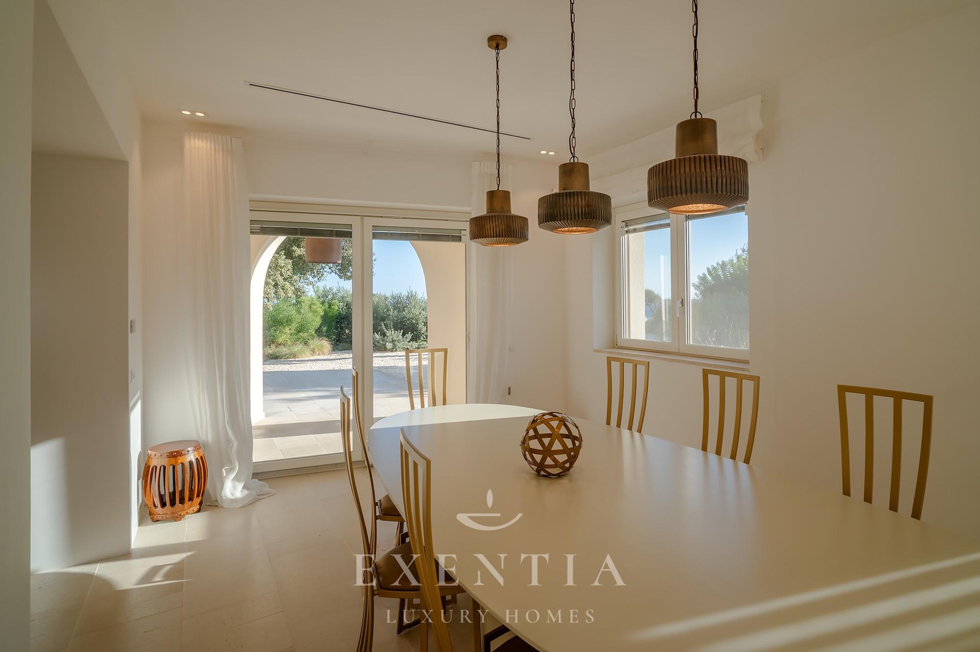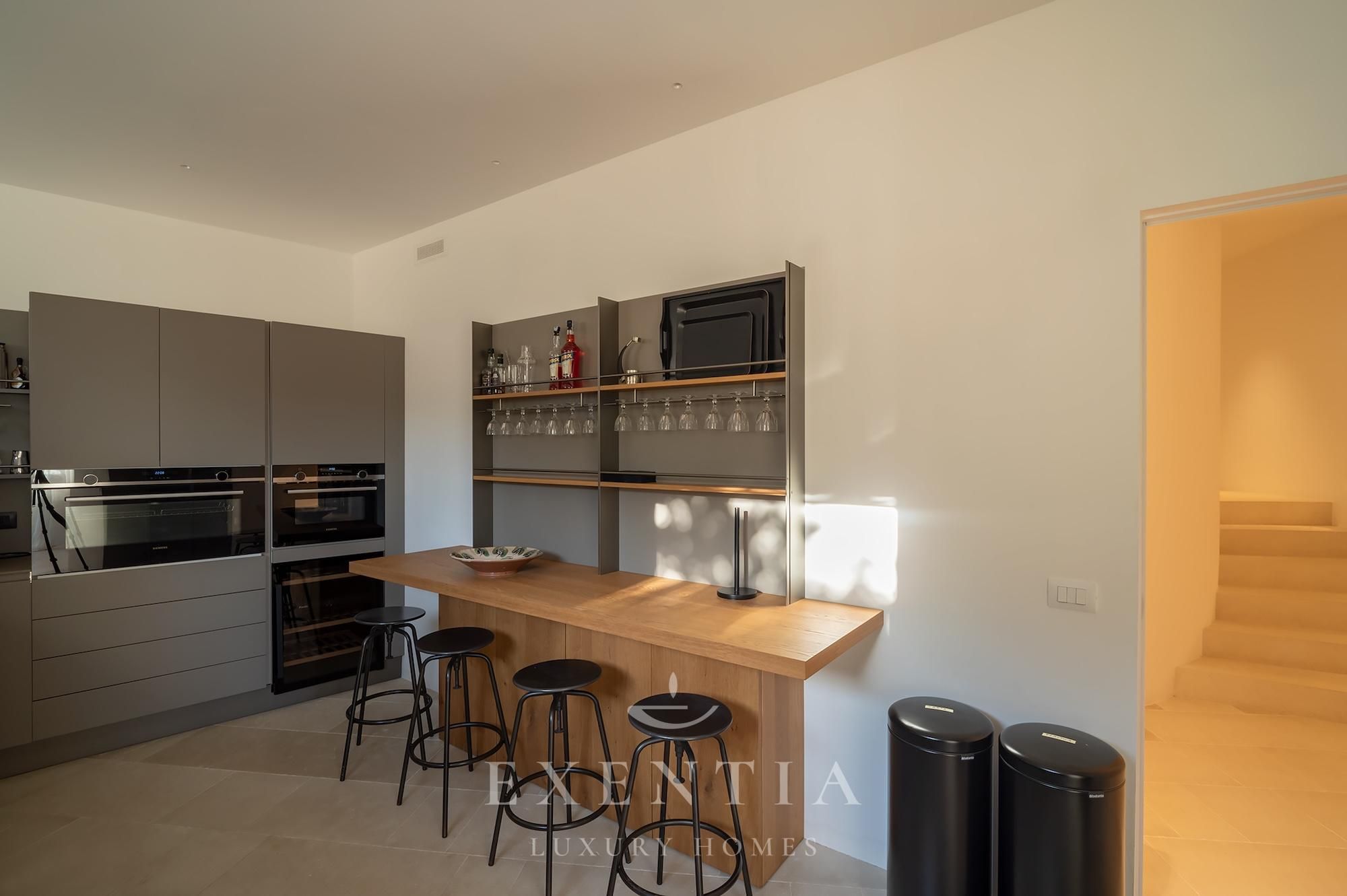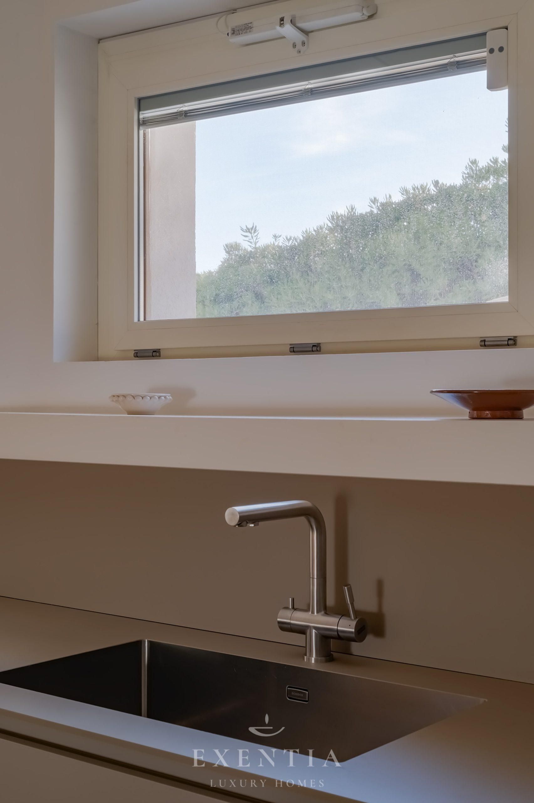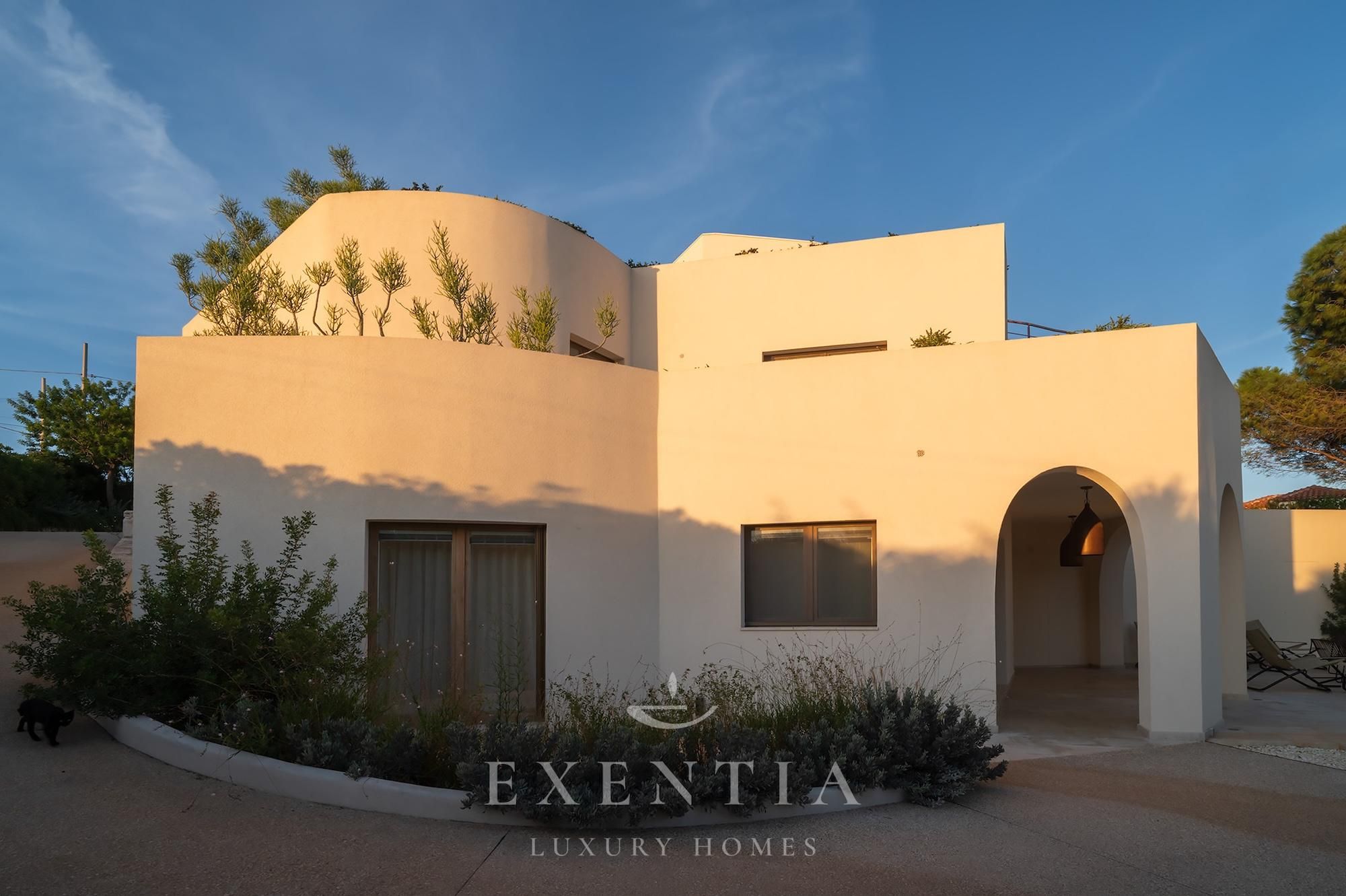 Outdoors, an infinity pool merges seamlessly with the horizon, suspended between sky and sea. Around it, a garden of aromatic essences — thyme, mastic, coastal lavender — accompanies the slow rhythm of the days.