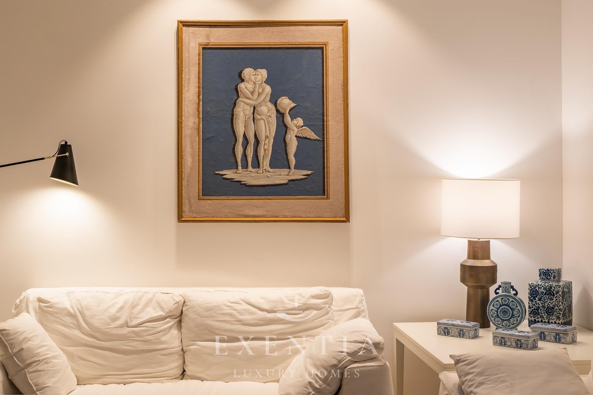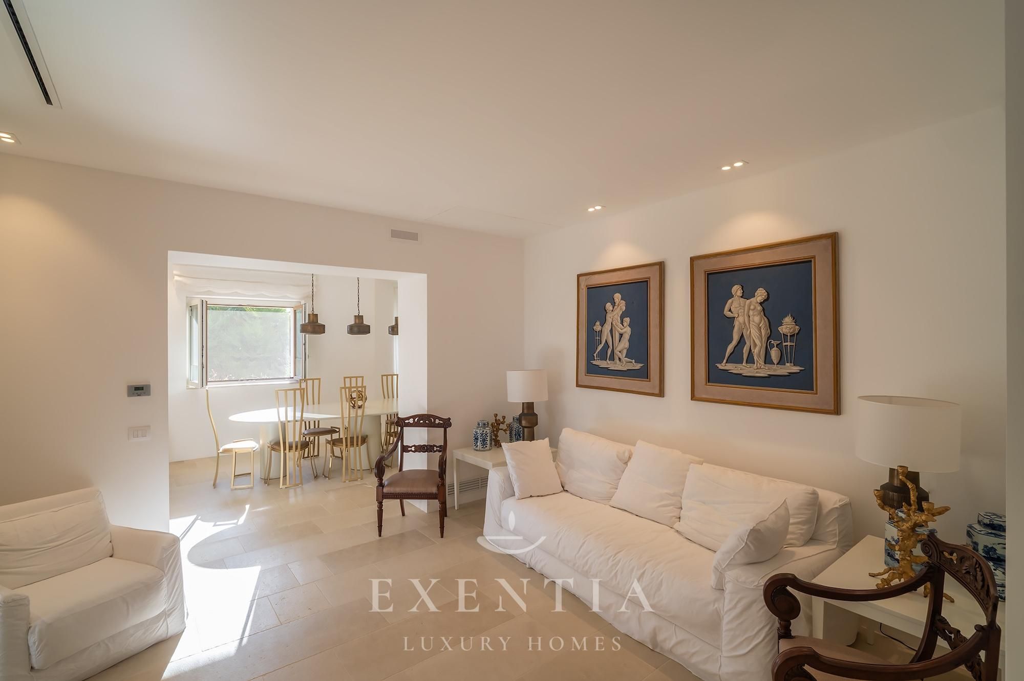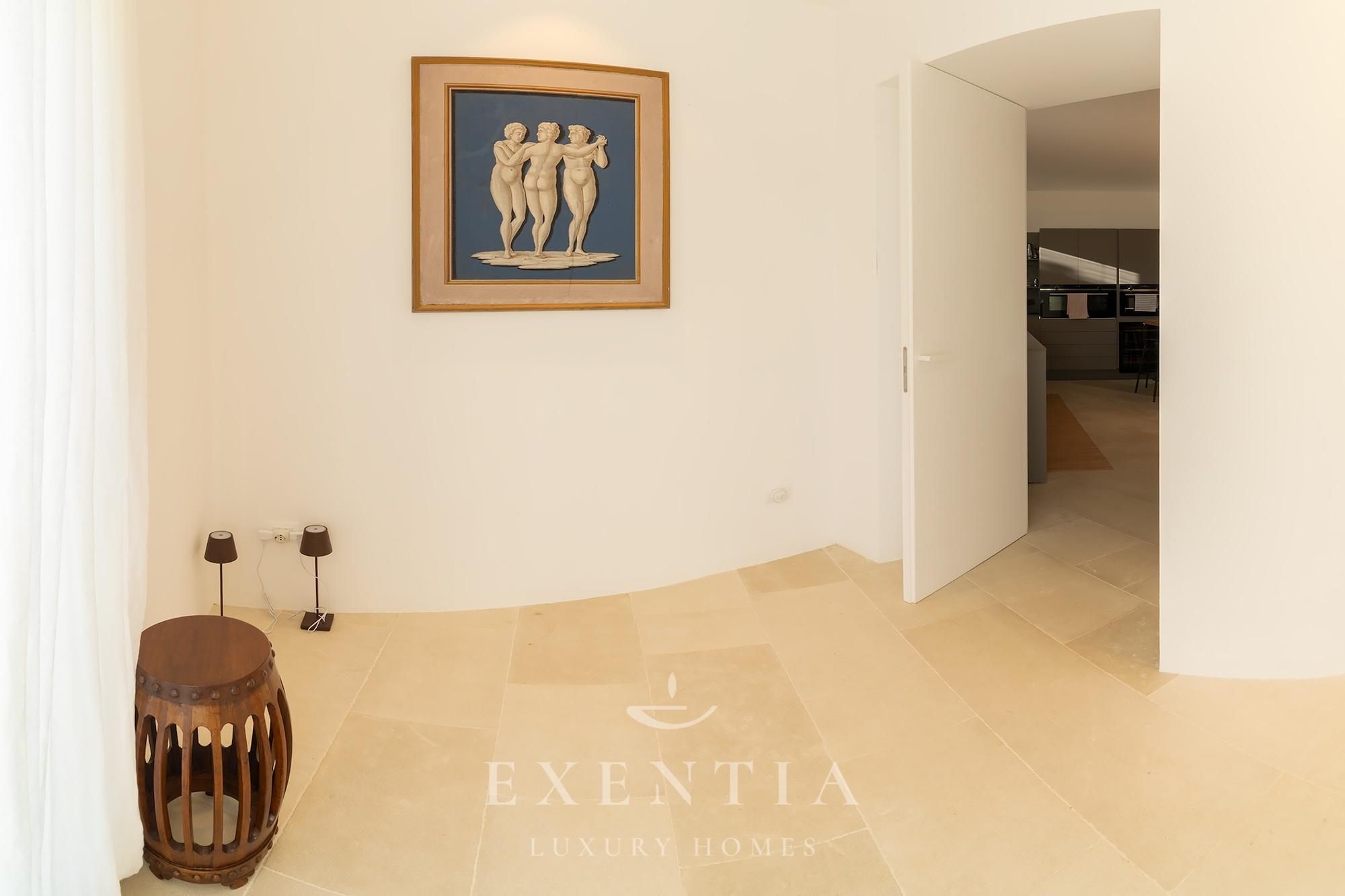 The design is restrained and tactile, favouring the tones of earth and salt — travertine, raw wood, natural fabrics — while carefully selected contemporary artworks and objects tell the story of the Mediterranean with grace and restraint.