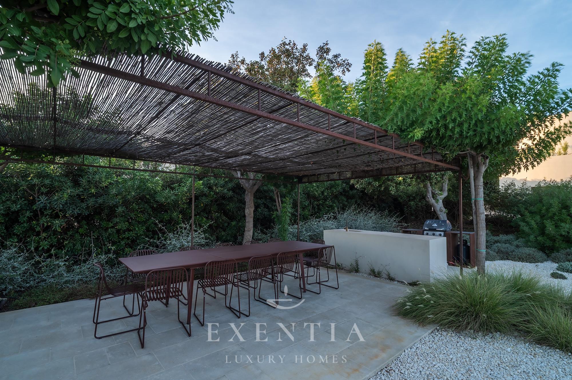 • Outdoor dining area under a pergola, featuring a large table and barbecue