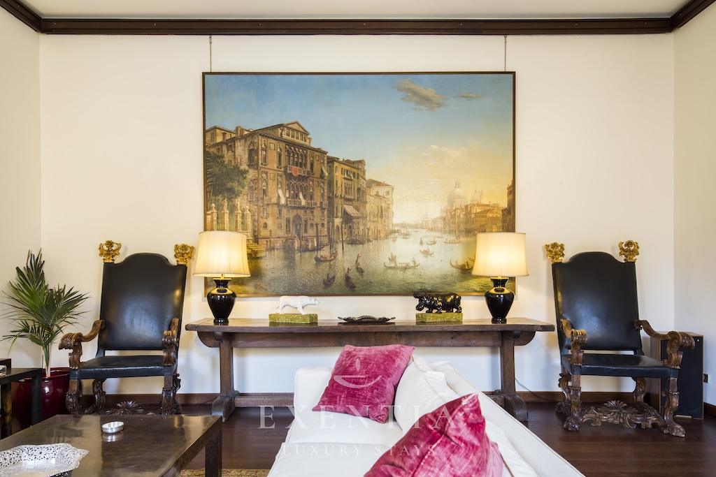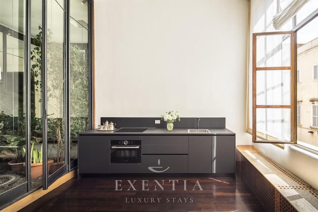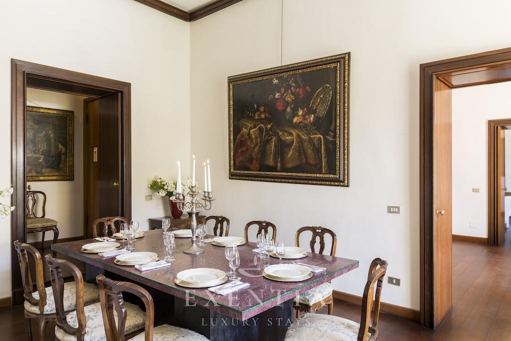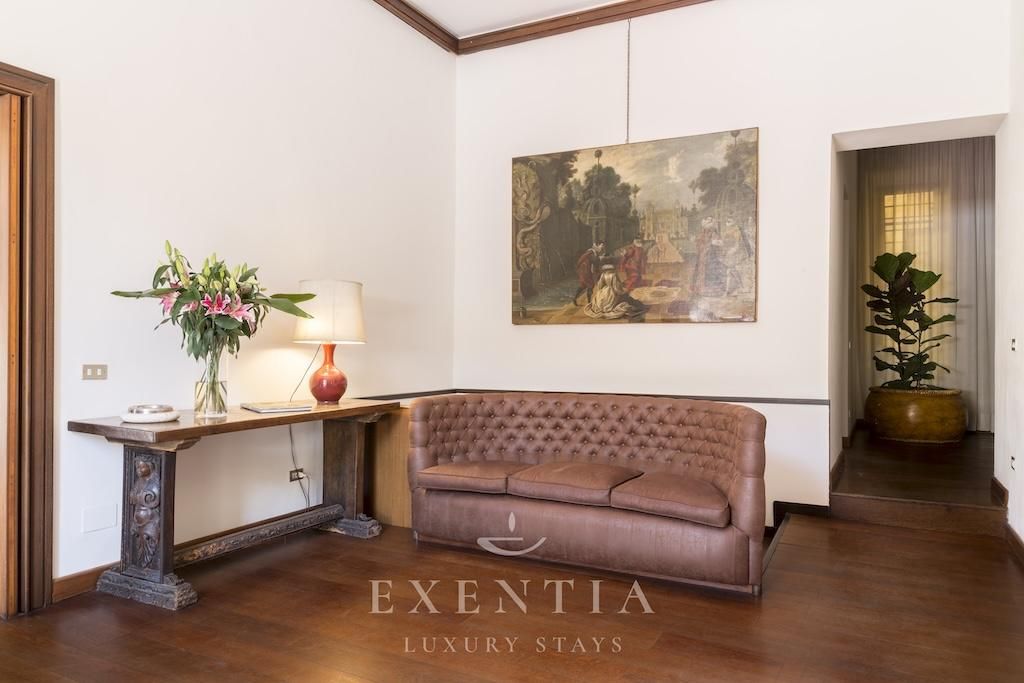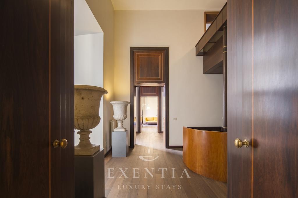 The elegant living spaces are designed for both relaxation and sophisticated entertaining. The main salon exudes understated grandeur, ideal for intimate gatherings or refined evenings in, while the formal dining area is perfectly suited for private dinners or bespoke catering experiences arranged by Exentia. A fully equipped designer kitchen combines functionality with style, making it ideal for private chefs or family meals in a luxury Roman setting.