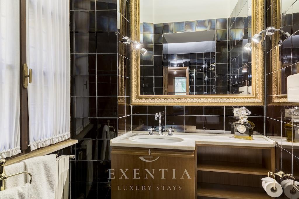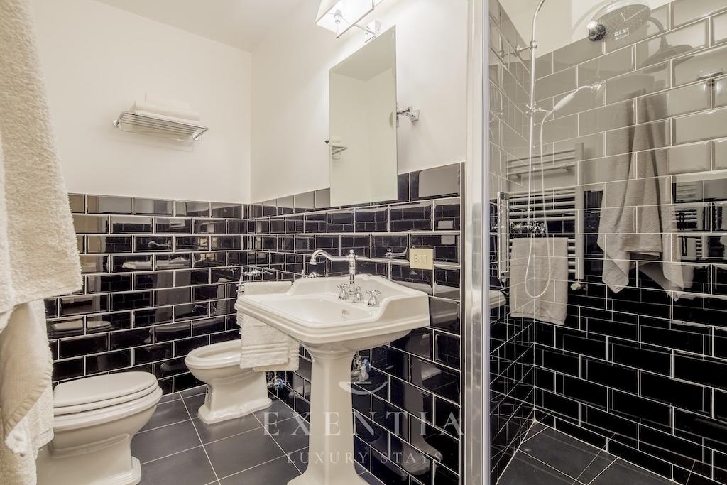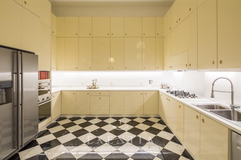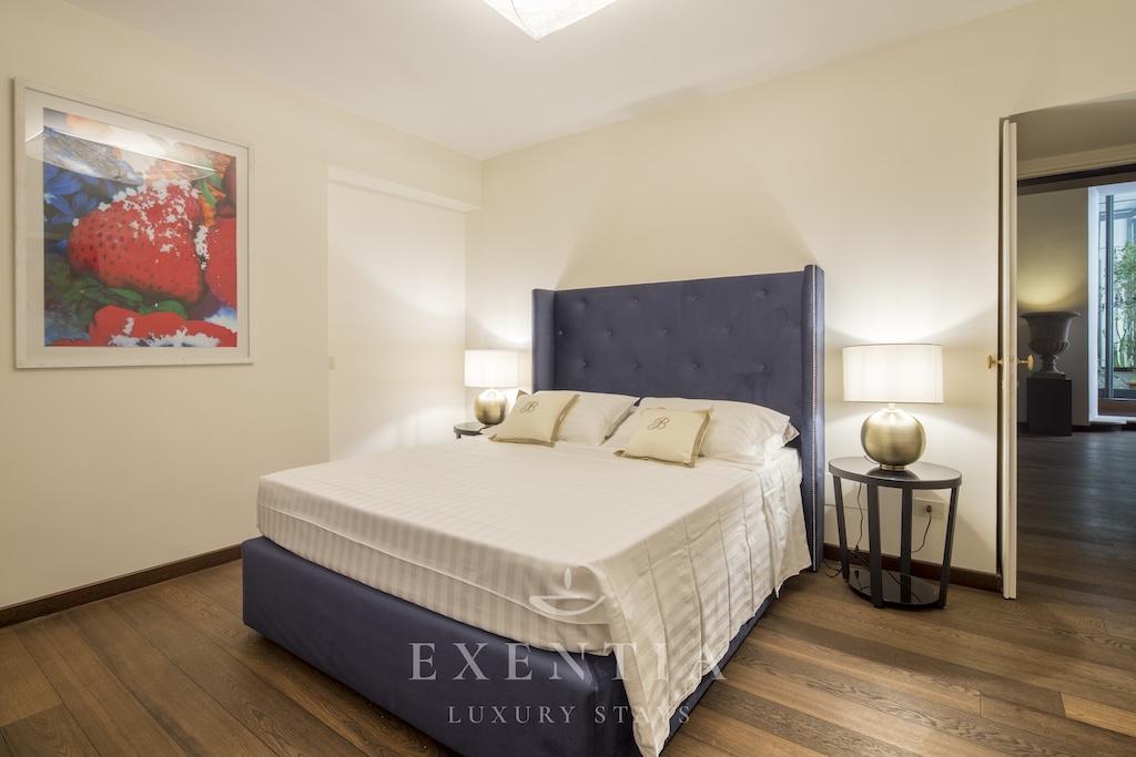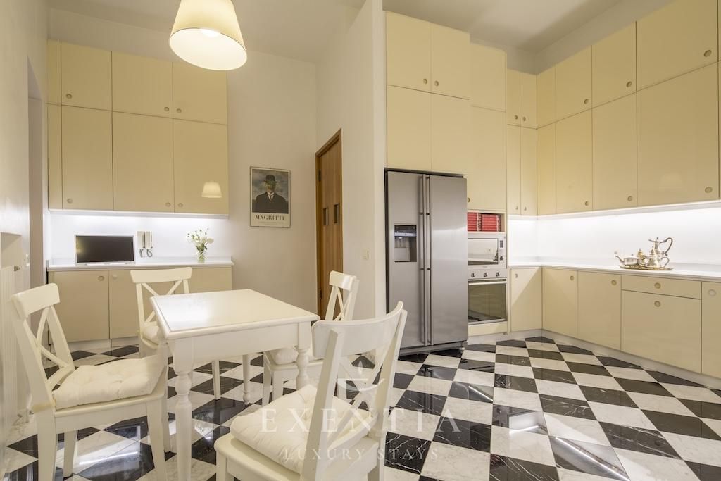The elegant living spaces are designed for both relaxation and sophisticated entertaining. The main salon exudes understated grandeur, ideal for intimate gatherings or refined evenings in, while the formal dining area is perfectly suited for private dinners or bespoke catering experiences arranged by Exentia. A fully equipped designer kitchen combines functionality with style, making it ideal for private chefs or family meals in a luxury Roman setting.