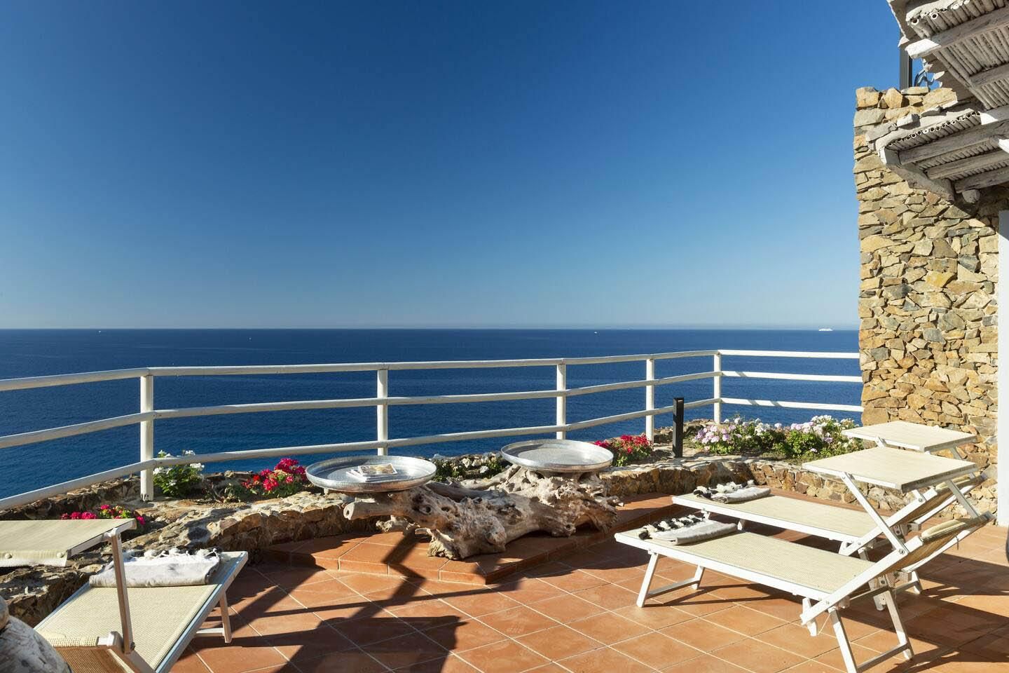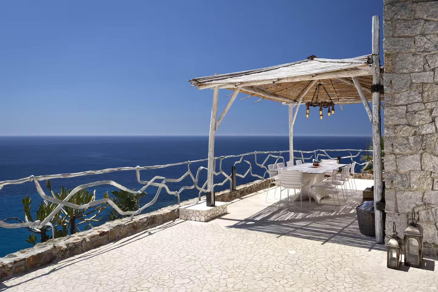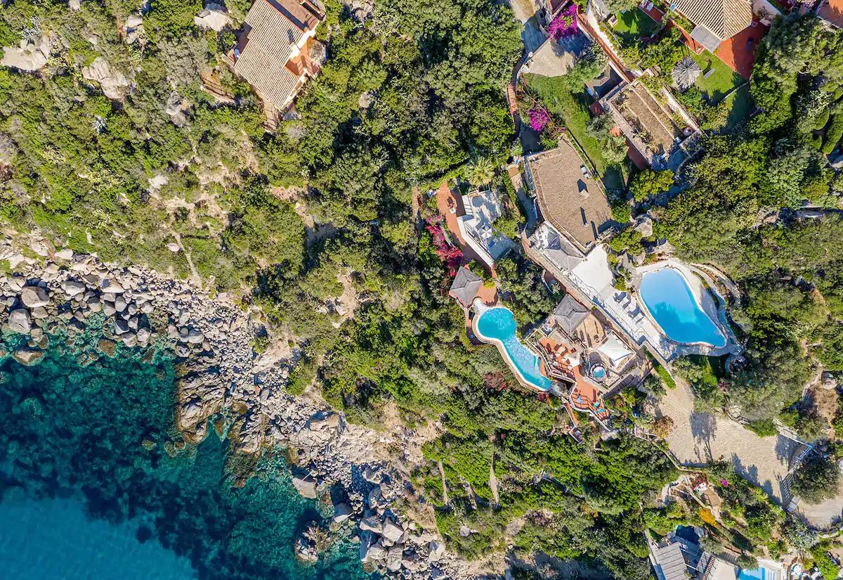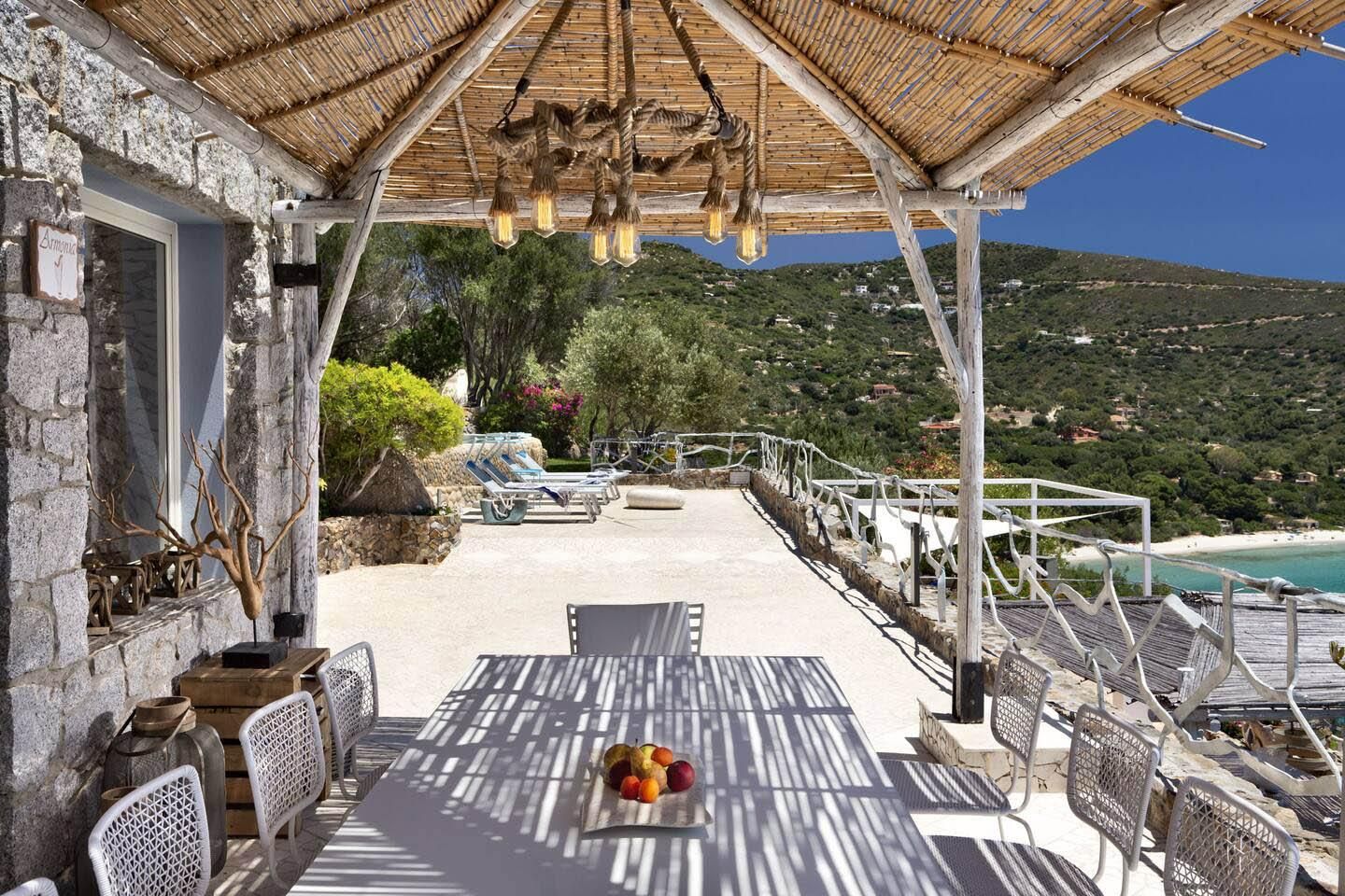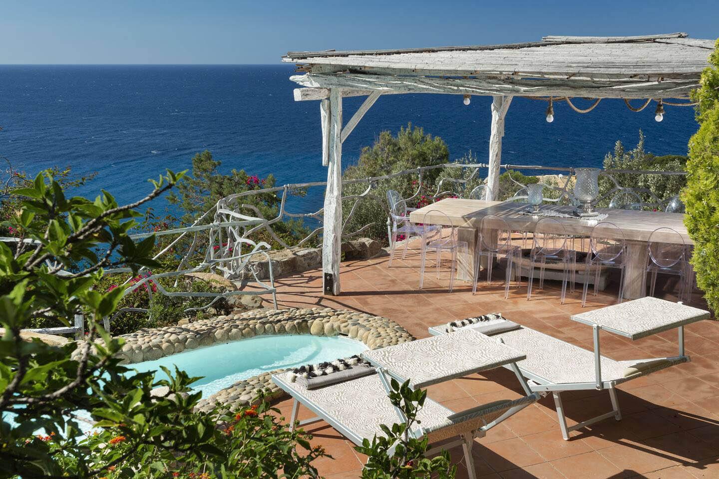 Villa sul mare con 5 suites per 26 persone, piscina, idromassaggio e vista panoramica sulla spiaggia di Genn’e Mari, immersa nel verde e ideale per famiglie e animali.
